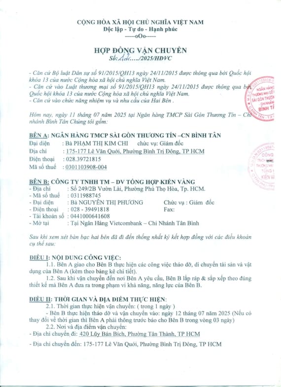 Hợp đồng vận chuyển cho Ngân hàng Sacombank Bình Tân