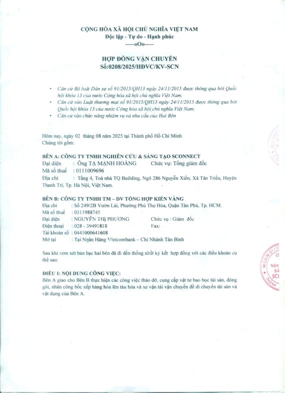 - Hợp đồng vận chuyển cho Công Ty Nghiên Cứu & Sáng Tạo Sconnect