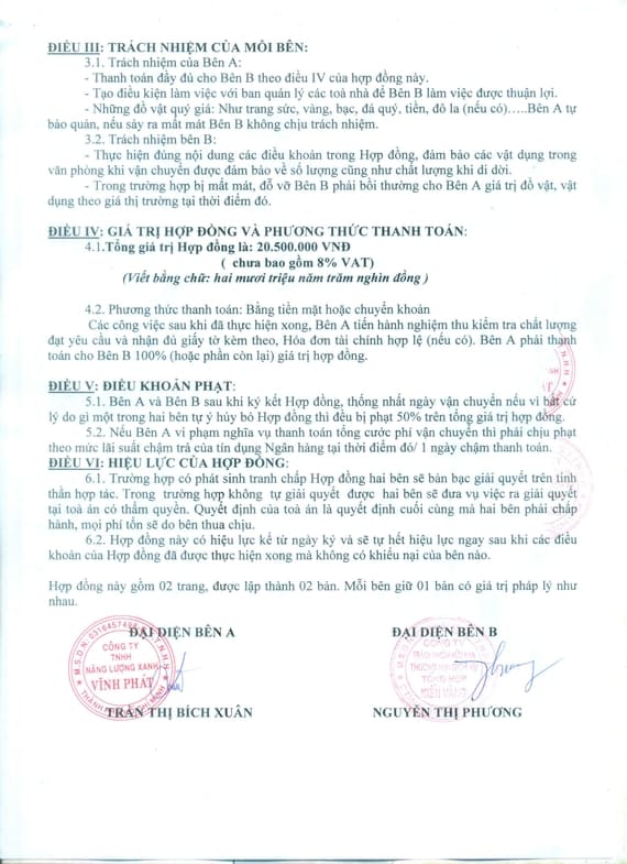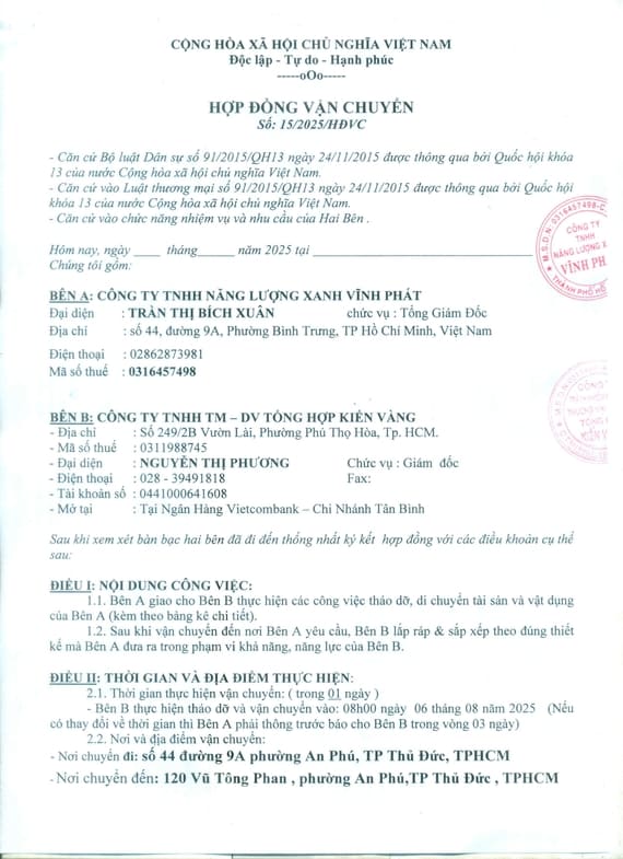 - Hợp đồng vận chuyển cho Công Ty Năng Lượng Xanh Vĩnh Phát