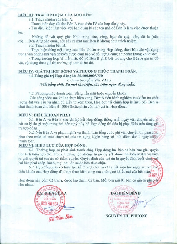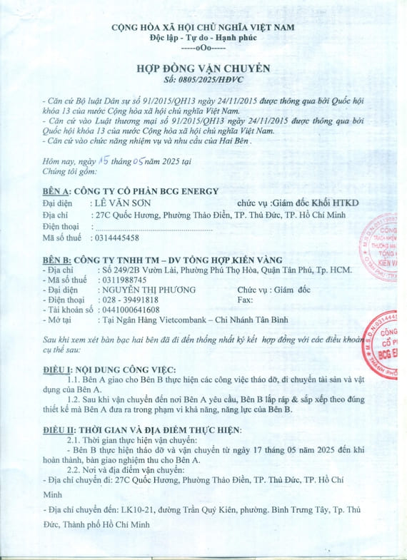 - Hợp đồng vận chuyển cho Công ty BCG Energy