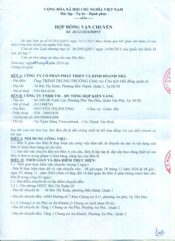 Hợp đồng vận chuyển cho Công Ty Phát Triển Và Kinh Doanh Nhà