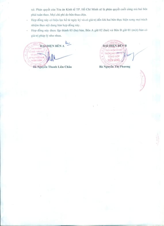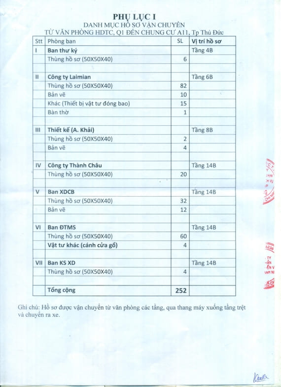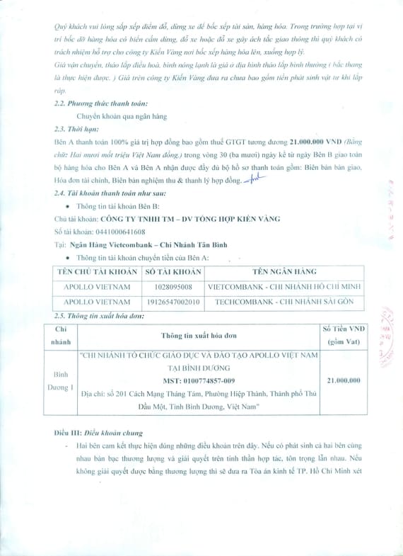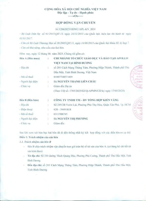 - Hợp đồng vận chuyển cho Chi nhánh Apollo Việt Nam tại Bình Dương