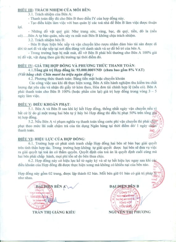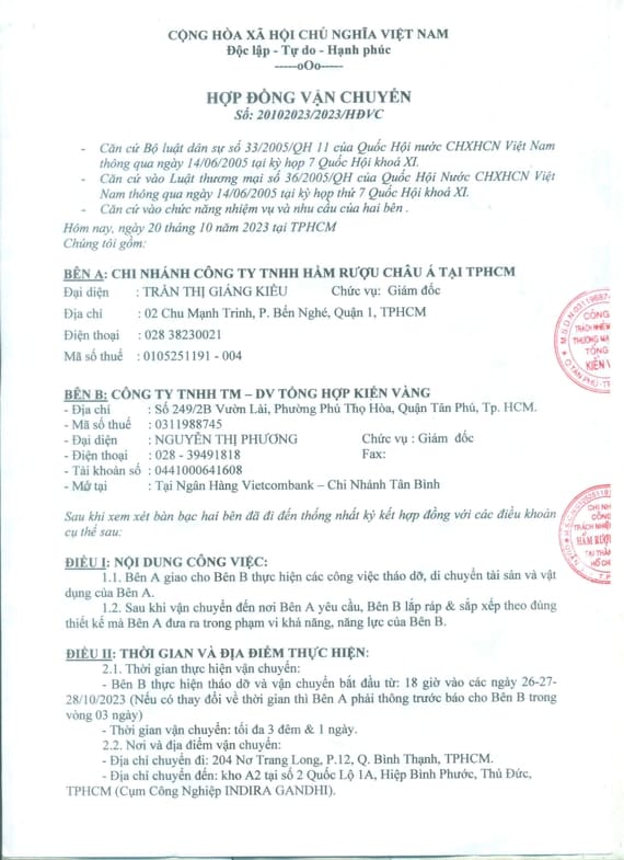 - Hợp đồng vận chuyển cho Chi nhánh Công Ty Hầm Rượu Châu Á Tại TPHCM