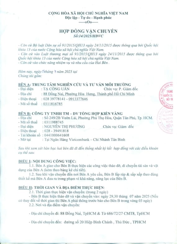 Hợp đồng vận chuyển cho Trung Tâm Nghiên Cứu Và Tư Vấn Môi Trường